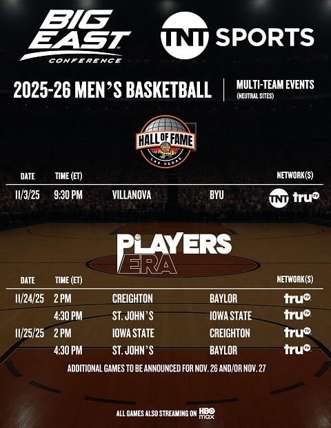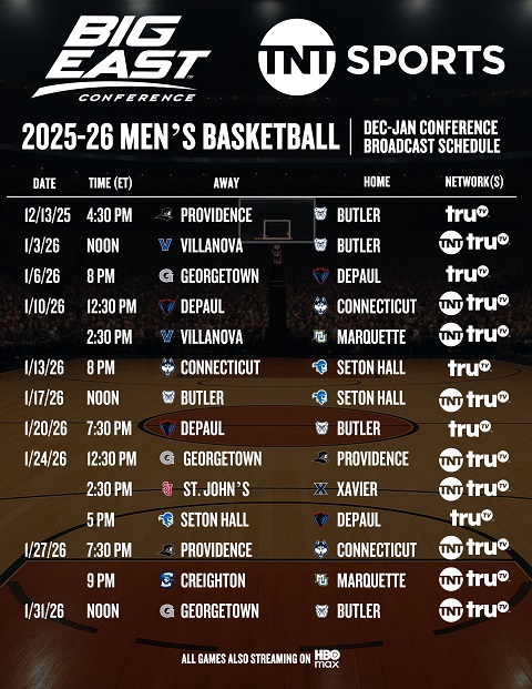 TNT Sports has announced the 2025-26 regular season broadcast schedule for its inaugural coverage of BIG EAST men's basketball, featuring 57 games airing across TNT, truTV, and HBO Max.