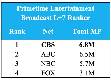 · #1 Network: CBS primetime entertainment programs average 6.8 million viewers