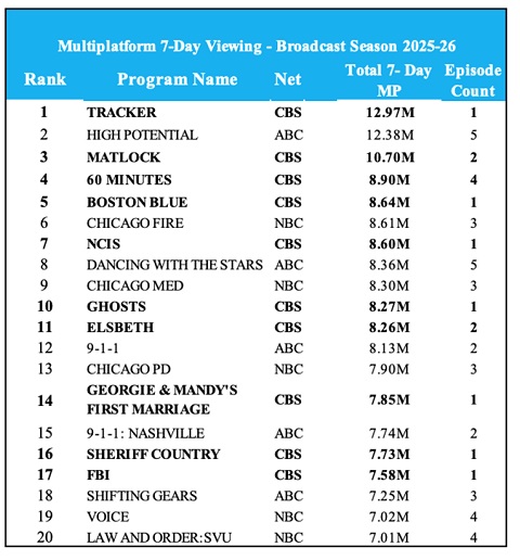· Seven Series with 8 Million or More Viewers: TRACKER, MATLOCK, 60 MINUTES, BOSTON BLUE, NCIS, GHOSTS, ELSBETH, GEORGIE & MANDY'S FIRST MARRIAGE