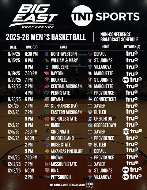 TNT Sports has announced the 2025-26 regular season broadcast schedule for its inaugural coverage of BIG EAST men's basketball, featuring 57 games airing across TNT, truTV, and HBO Max.