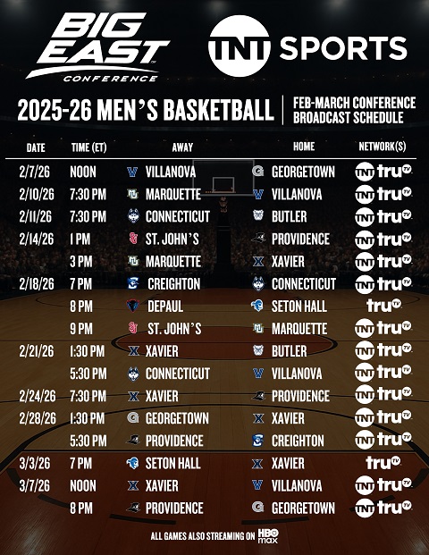 TNT Sports' regular season BIG EAST men's basketball schedule will feature 40 appearances by St. John's, UConn, Creighton, Xavier, and Marquette, programs that each clinched berths in last season's NCAA Men's Tournament.