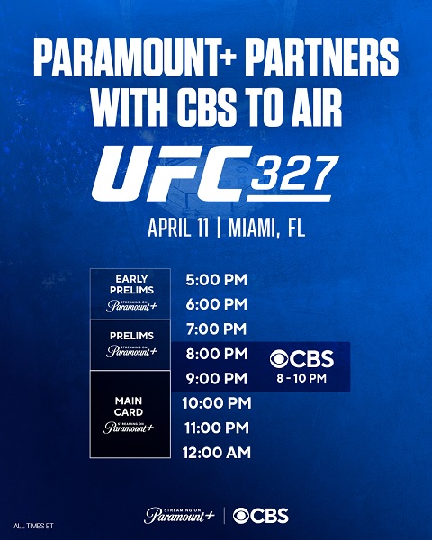 · UFC 327 prelims will begin at 7:00 PM ET on Paramount +; CBS will simulcast the final hour of the prelims live from 8:00-9:00 PM ET/5:00-6:00 PM PT.