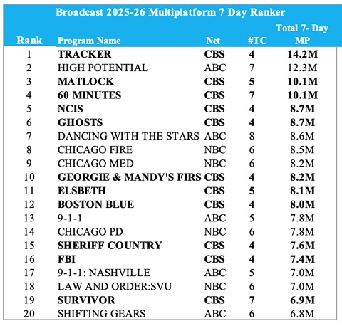· Five of the top six series, including: #1 TRACKER, #3 MATLOCK, #4 60 MINUTES, #5 NCIS and #6 GHOSTS