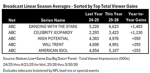 · With the Top 20 hopefuls performing inspiring songs of faith, "American Idol" grew by double digits over the show's audience on the same night last year (+11%; vs. 4.36 million on 3/31/25) and also grew impressively over last season's first Monday live show (+6%; vs. 4.57 million on 4/21/25).